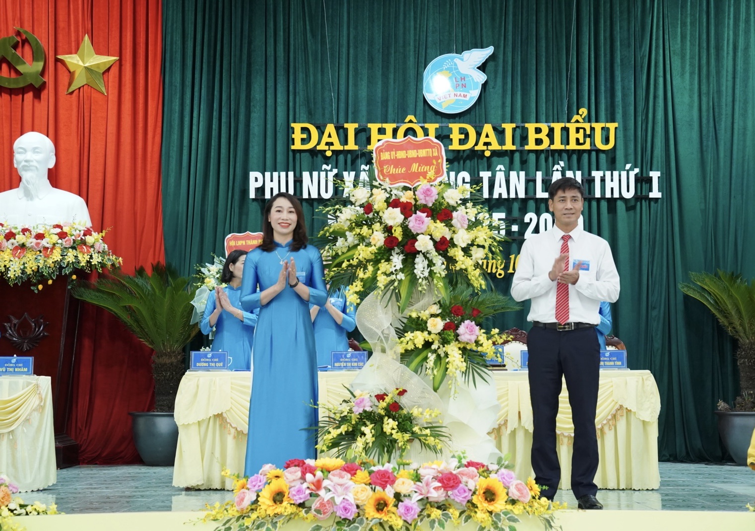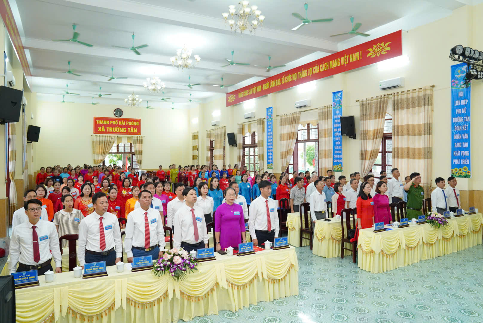 Dự, chỉ đạo Đại hội có đồng chí Hoàng Thị Chính – Ủy viên Ban Chấp hành Hội LHPN thành phố Hải Phòng, Phó Trưởng ban Công tác phụ nữ; về phía xã Trường Tân có các đồng chí Phạm Văn Tuyên – Bí thư Đảng ủy, Chủ tịch HĐND xã; Vũ Thị Hải Hậu – Phó Bí thư Thường trực Đảng ủy; Phạm Đình Khải – Phó Bí thư Đảng ủy, Chủ tịch UBND xã; cùng các đồng chí trong Ban Thường vụ Đảng ủy, lãnh đạo UBND xã, đại diện các ban, ngành, đoàn thể và 150 đại biểu chính thức đại diện cho 6.488 hội viên phụ nữ toàn xã.