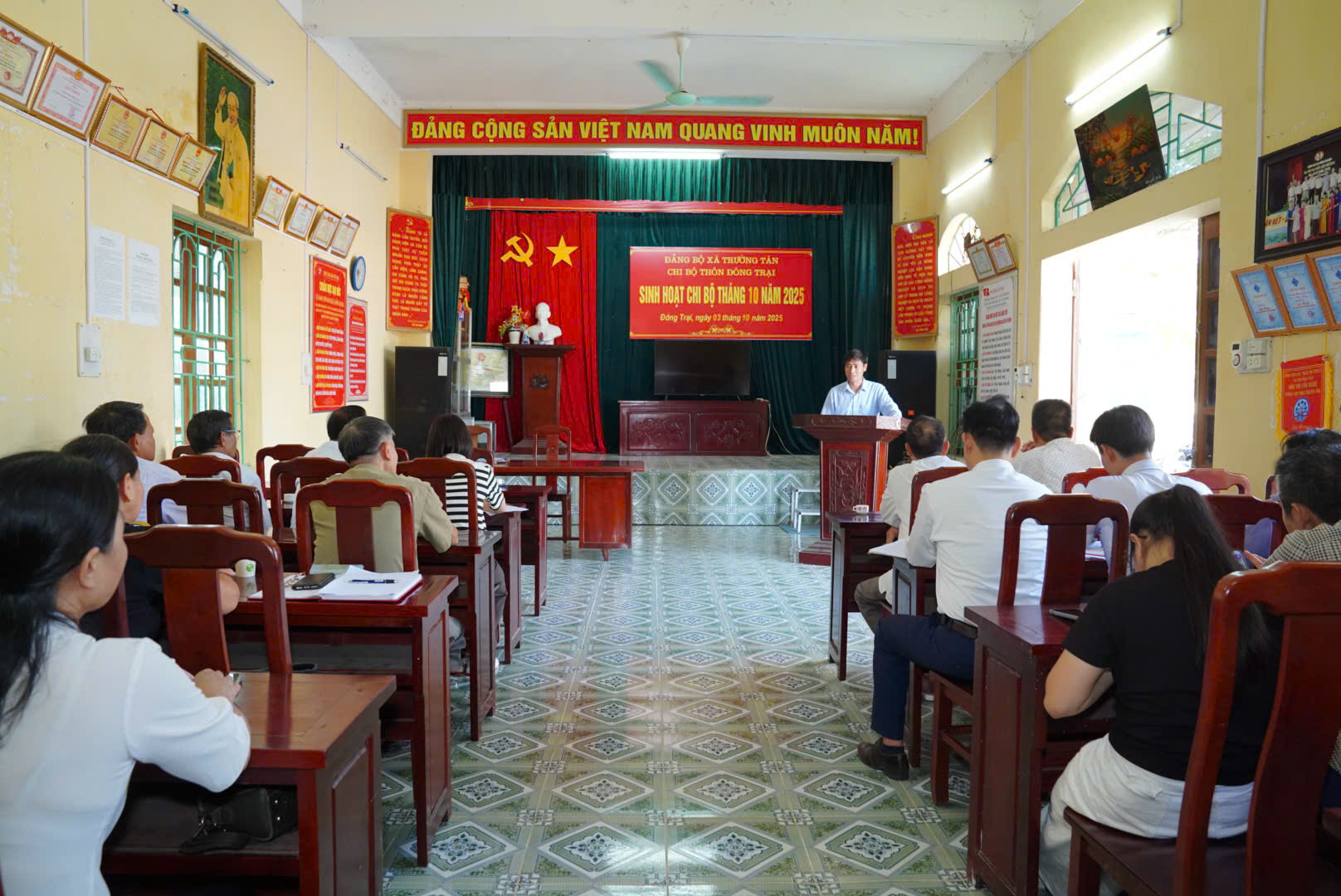 Chiều 3.10, Chi bộ thôn Đông Trại, xã Trường Tân tổ chức sinh hoạt thường kỳ tháng 10.2025. Dự buổi sinh hoạt có đồng chí Phạm Văn Tuyên, Bí thư Đảng uỷ, Chủ tịch HĐND xã.